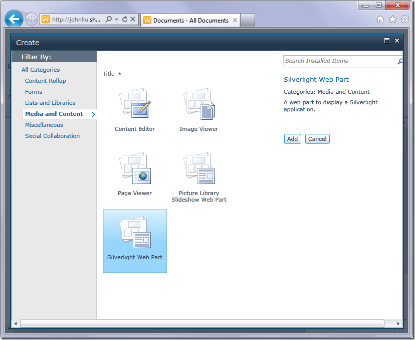 6. The Office 365 Web Part Adder is a lot prettier. Select the Silverlight Web Part
