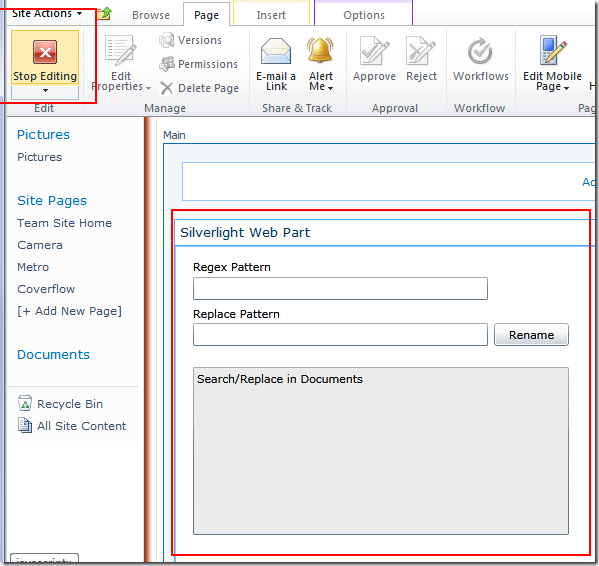 - Finally, the Ribbon is contextual and you may find that since there is an extra webpart on the page, your normal List ribbons don’t appear unless you focus on the list webpart. If you can’t stand this anymore (I can never last more than a few minutes), remove the Silverlight webpart or add it to a different page. DocRename.xap