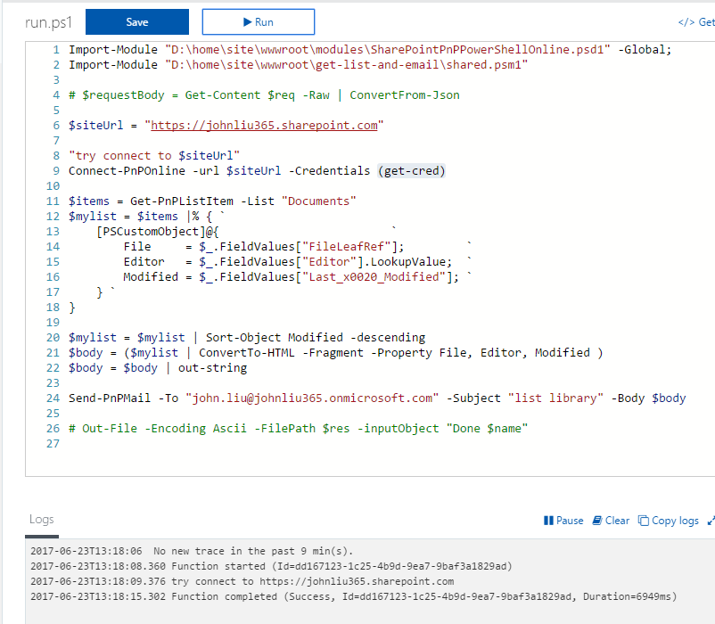 https://github.com/johnnliu/azure-functions-o365/blob/master/sharepoint-list-email.ps1