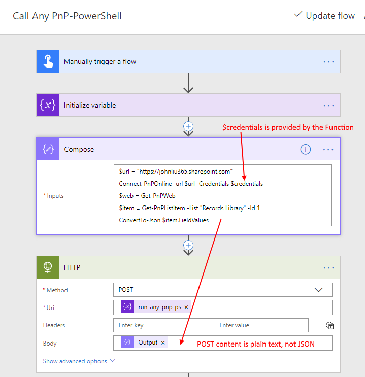 Are you missing a SharePoint connector in Flow? Do you need that one extra thing that’s only in PnP-PowerShell (because there are 300 cmdlets in PnP-PowerShell)? Frustrated with having to write another AzureFunction just for this one thing?