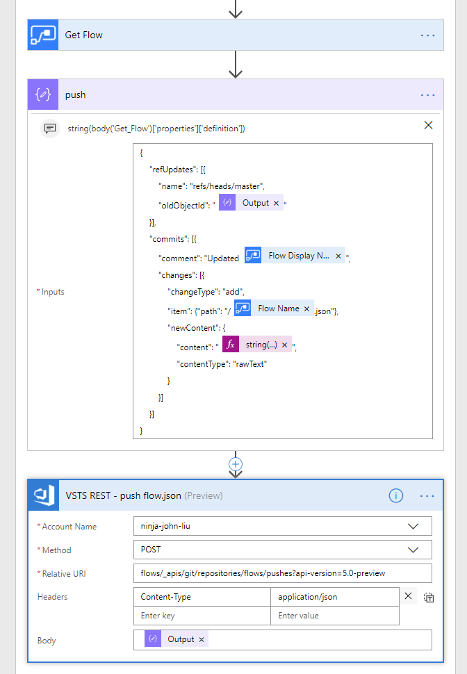 Next we compose the GIT PUSH body json. It needs oldObjectId we got from GIT Commits earlier. And we are either “add” or “edit” files. I use the Flow Name.json to be the file name - that is a GUID. My reasoning is that guids don’t change, display names do. So guid would keep better history. You may decide display names are better filenames.