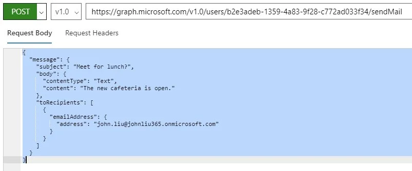 Next, we head over to Microsoft Graph Explorer and grab a sample of the Exchange SendMail
