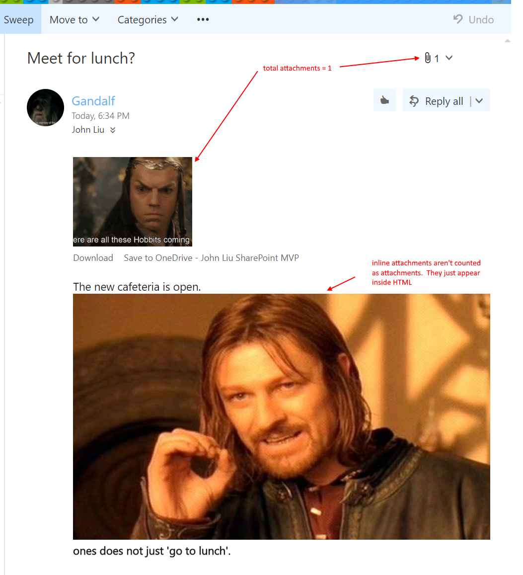 I left the original attachment as a comparison. See the second attachment is marked inline and has a contentId - boromir12345. The contentId is used in the HTML content as a embed reference: cid:boromir12345