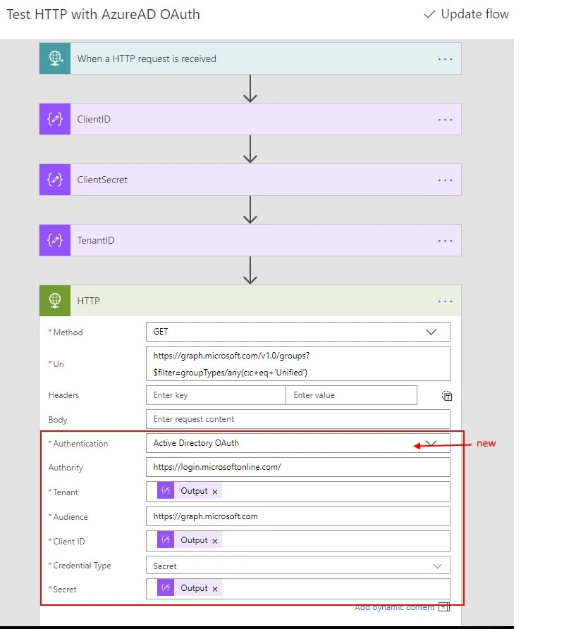 When we set Authentication to “Active Directory OAuth” - we can specify the Client ID / Client Secret in one HTTP action - so we don’t need to make two separate calls first to Authenticate and get an access token, then call the flow we want and add the bearer header token.