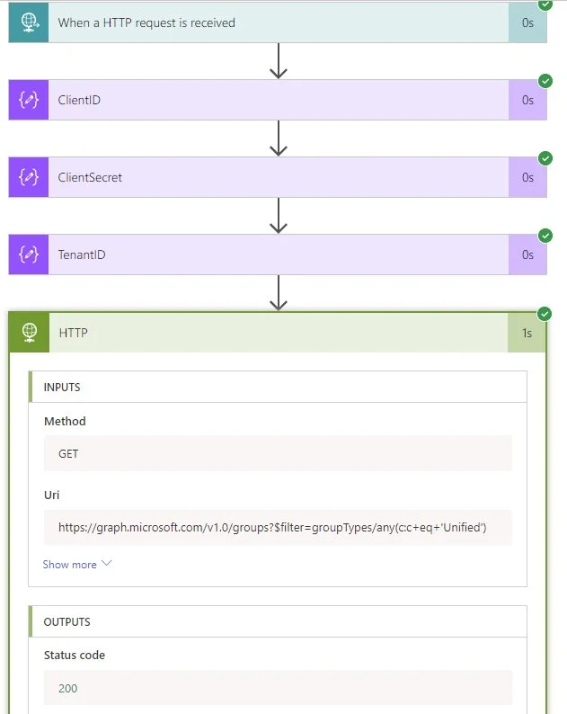 Calling Microsoft Graph directly with as simple as 1 HTTP request action means that a lot of slightly-more complex task of authenticating, then getting an access token, then calling MSGraph with bearer header becomes a whole lot easier.