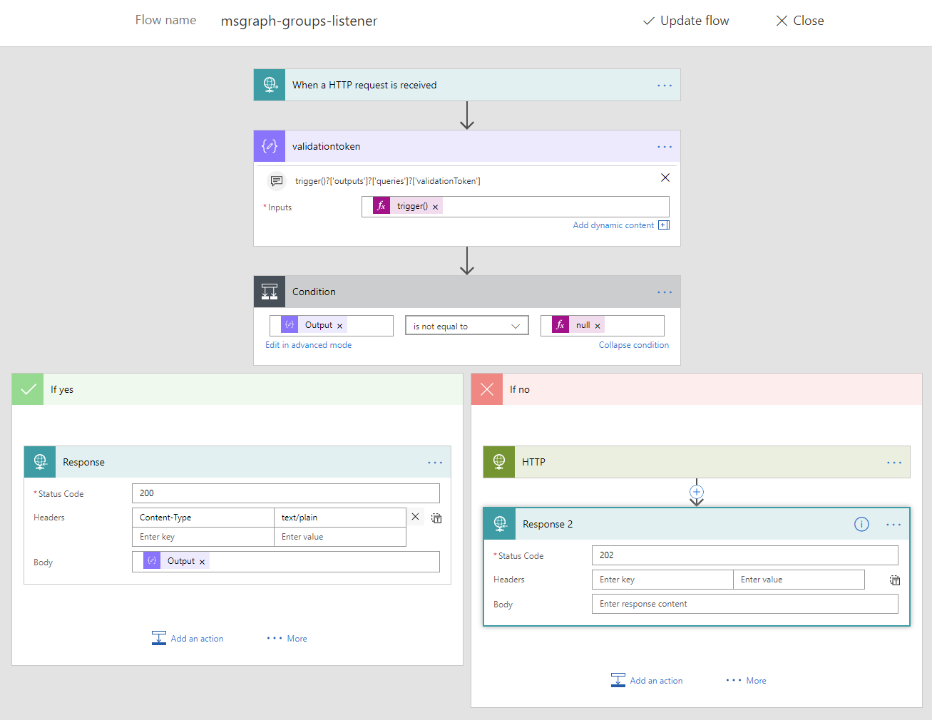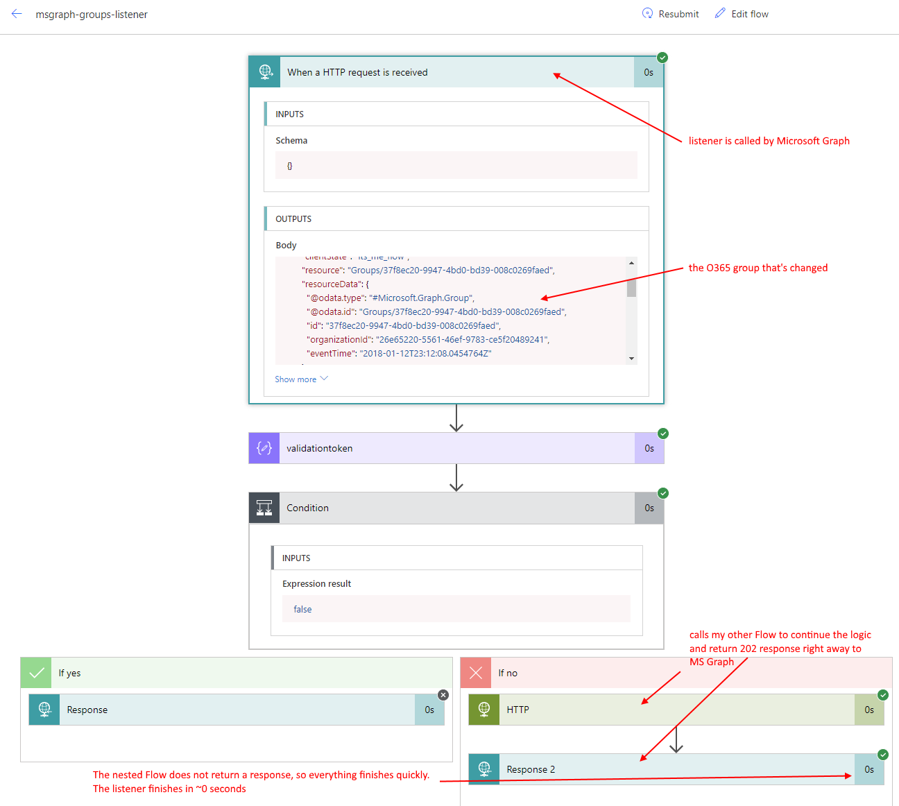 I call another Flow to start dealing with the change. The other Flow does not return a response. So the HTTP action can happen quickly as a trigger, and I can return 202 accept response to Microsoft Graph quickly.
