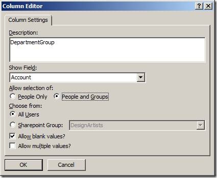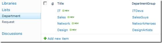 I plan to use re-usable workflows later to configure the list item permissions. So I need to create a few site columns, here’s the first one DepartmentGroup. This is basically a People or Groups field.