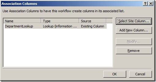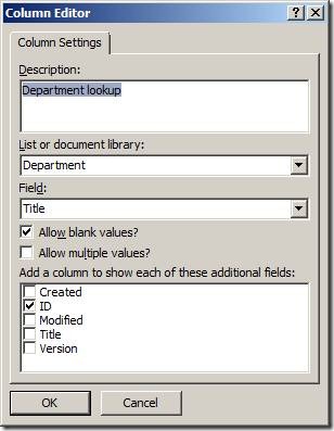 Here’s the second site column. This is a lookup column to the Department list. I’m bringing over the ID field as an additional field.