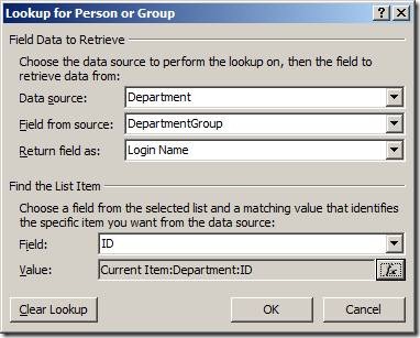 The field we want is DepartmentGroup (our Person and Group site column). Return the field as Login Name