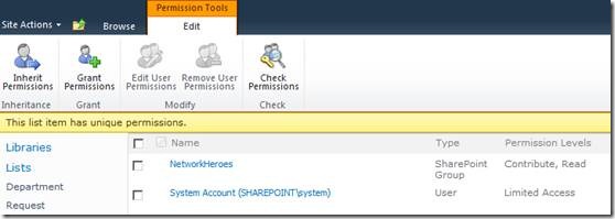 “NetworkHeroes” has been assigned “Contribute” and “Read” permissions to the list item - everyone else has been stripped out.