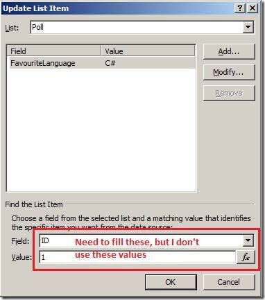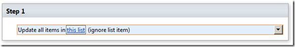 Unfortunately, because I cheated and use Microsoft’s dialog - it won’t let us finish without specifying a List Item - hence I use the sentence “Update all items in this list (ignore list item)” - sorry - hope that was clear.