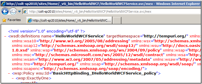 - The endpoint is at http://server/_vti_bin/HelloWorldWCF/HelloWorldWCFService.svc/mex