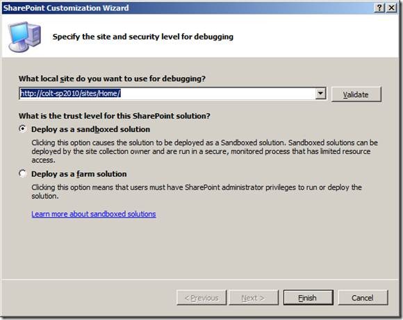 Figure: Provide a debug site, and choose Sandboxed solution