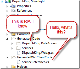 In Silverlight 3 we got RIA and the DomainService, having Silverlight project linked to a Web Project meant that Visual Studio automatically started generating all the RIA/DomainService code, as well as the data objects (or entity) required, and making sure everything’s available and synchronized between the Web (service) and Silverlight (client). There was much rejoicing.
