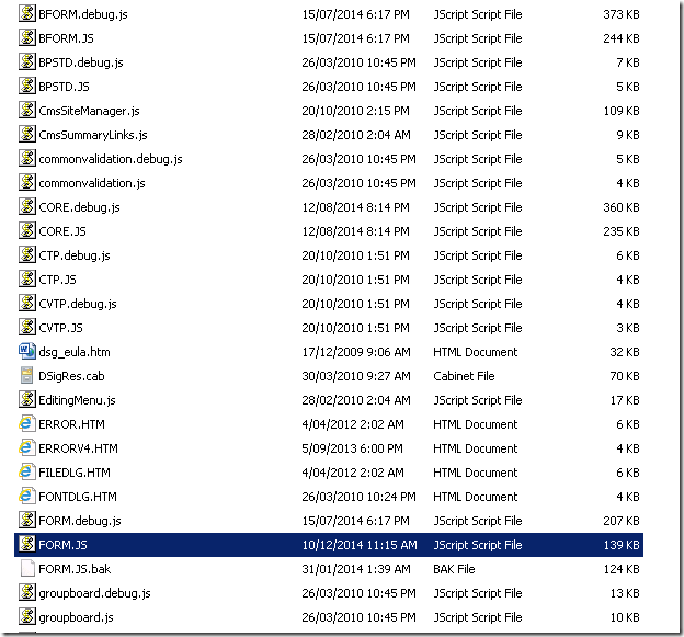 On December 10, 2014, before we patched to the August 2014 CU level. A certain very naughty person (me) couldn’t wait and decided to offer a quick hack to the Javascript for the users over the holidays. He even did a bak backup file of the original Form.js