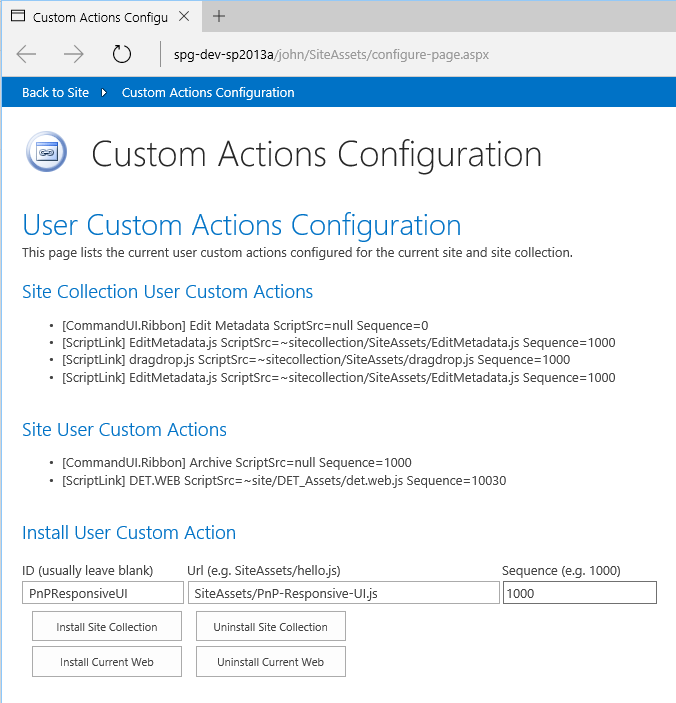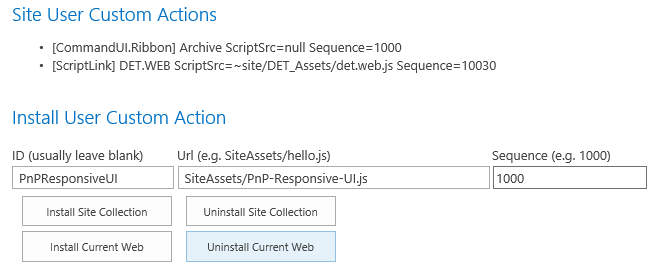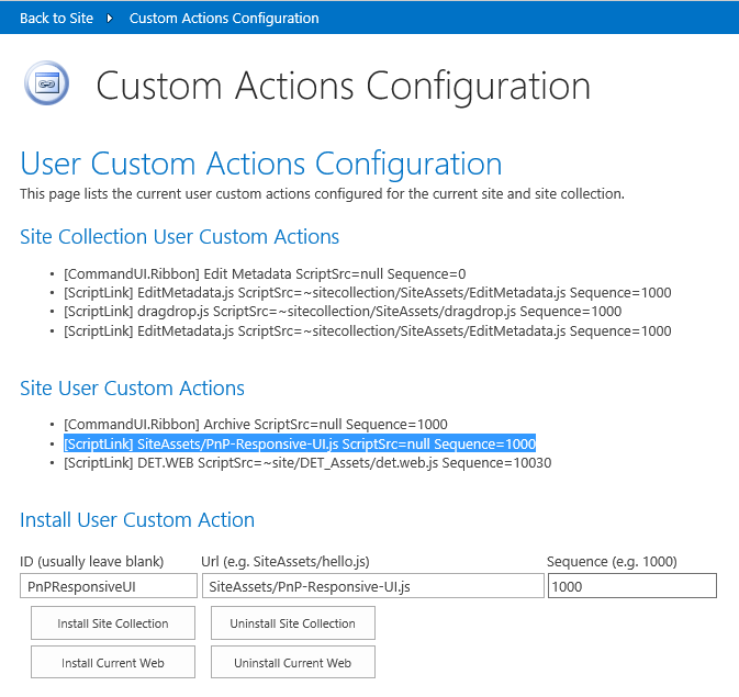 Install to Current Web. The Site User Custom Actions list should reflect there is now a SiteAssets/PnP-Responsive-UI.js inserted. There is no ScriptSrc, because it is inserted via ScriptBlock.