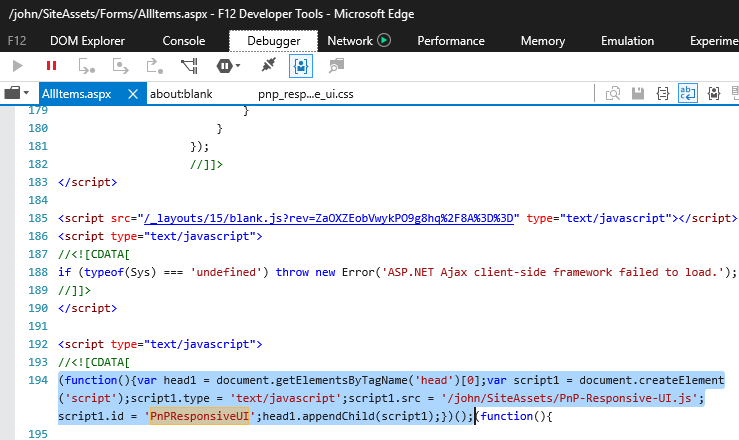 The Debugger shows both CSS and JS are injected correctly. Note, I’m injecting from my own SiteAssets library. PnP creates a folder under Style Library.