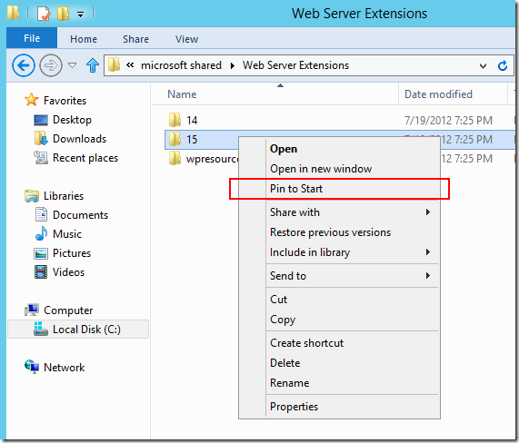 SP2013 - Pin your SharePoint Root 15 folder 2012.07.30 · 1 min read First, pin your SharePoint Root (Folder 15) to Start screen Enjoy WinKey-15 productivity Newer post SP2013 Custom services deploys and runs on v15 Older post The SharePoint Pinterest-style Image Library