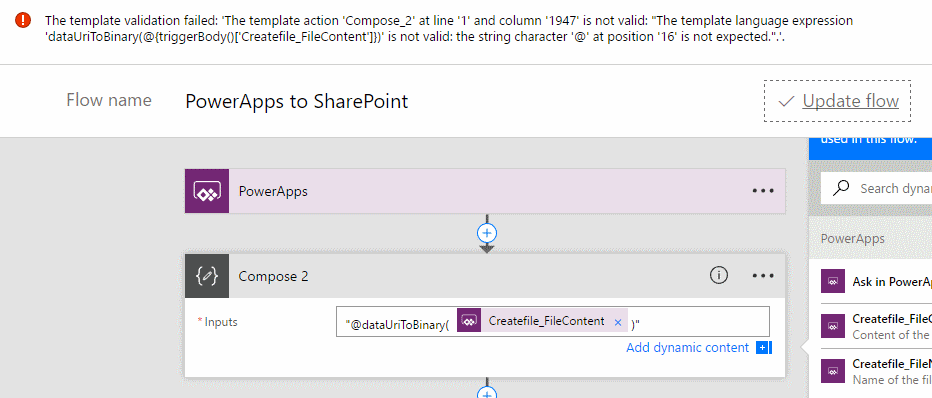 The template validation failed: ‘The template action ‘Compose’ at line ‘1’ and column ‘1947’ is not valid: “The template language expression ‘dataUriToBinary(@{triggerBody()[‘Createfile_FileContent’]})’ is not valid: the string character ’@’ at position ‘16’ is not expected.”.’.