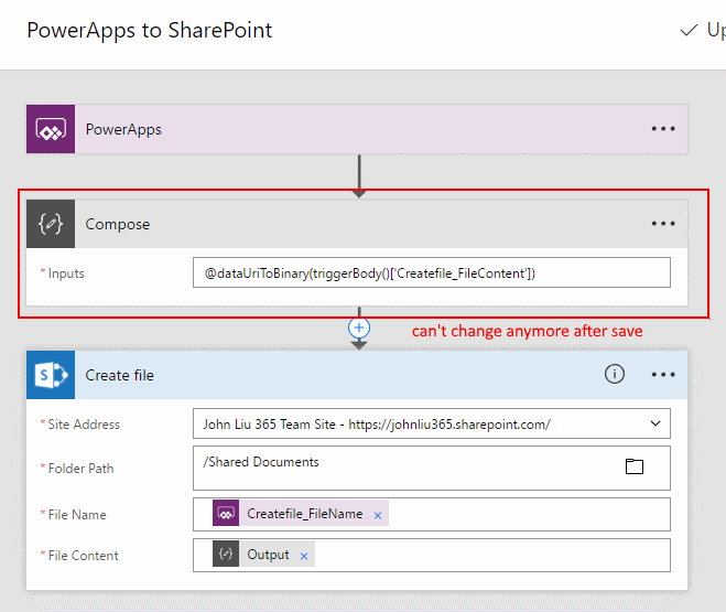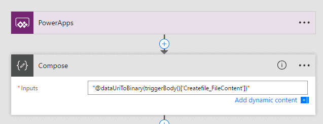 Add “@dataUriToBinary( … )” drag in Createfile_FileContent. It’ll look OK at first, but if you try to Update flow, you’ll get an error.