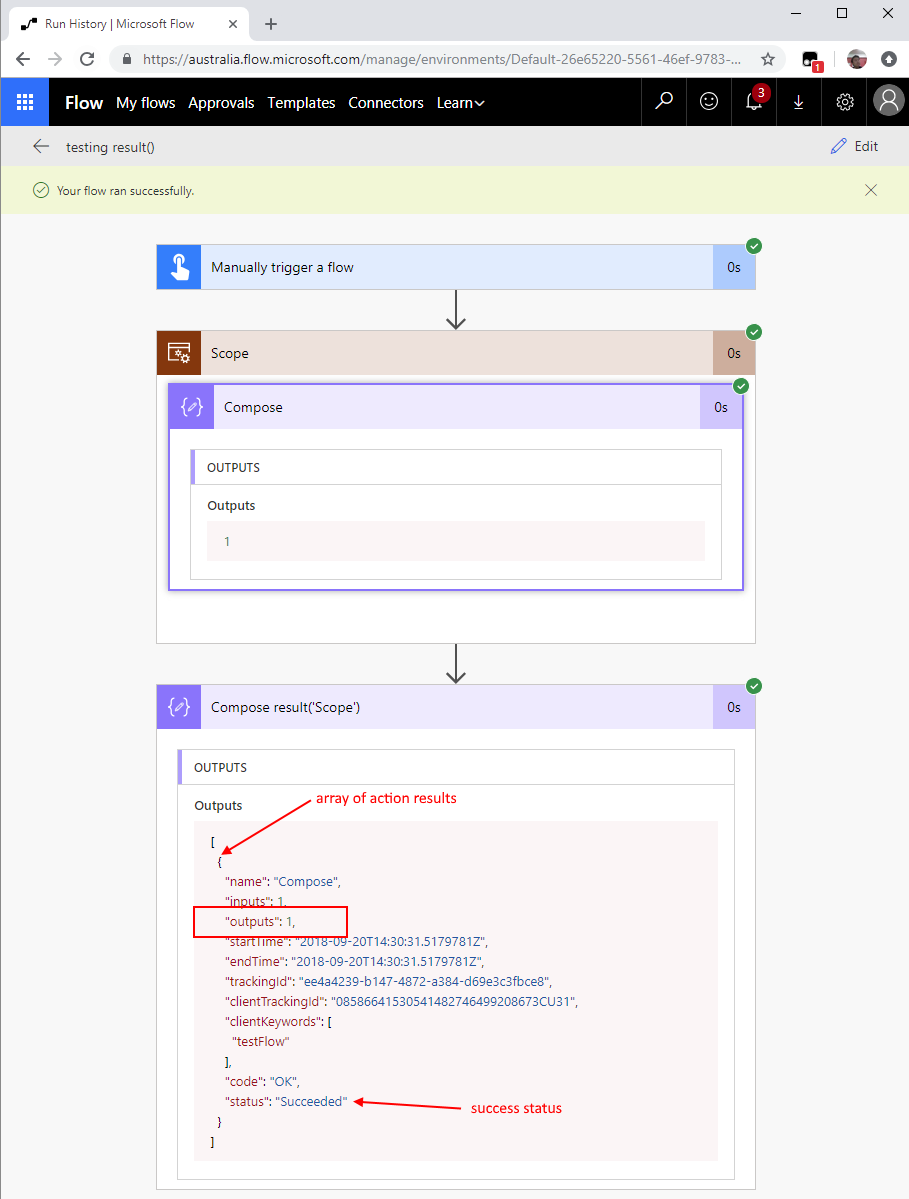 Wrapping our test action inside a Scope, result(‘Scope’) returns actual real data.