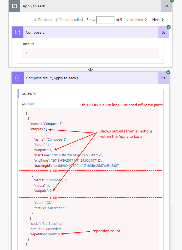 The Apply to each block is extremely interesting. Because it returns outputs from every iteration. It is very very long.