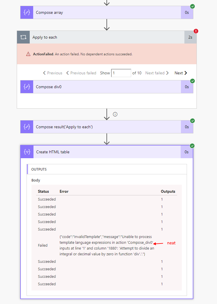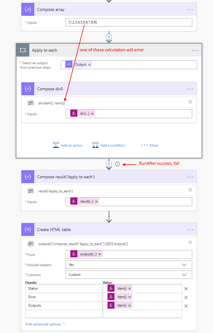 On the other side - we have apply-to-each and then we just output the result we want in a compose action. We use a Select after the apply-to-each to map the output from the result() function.