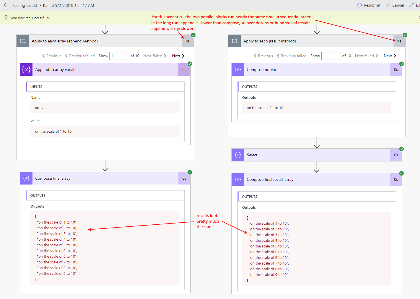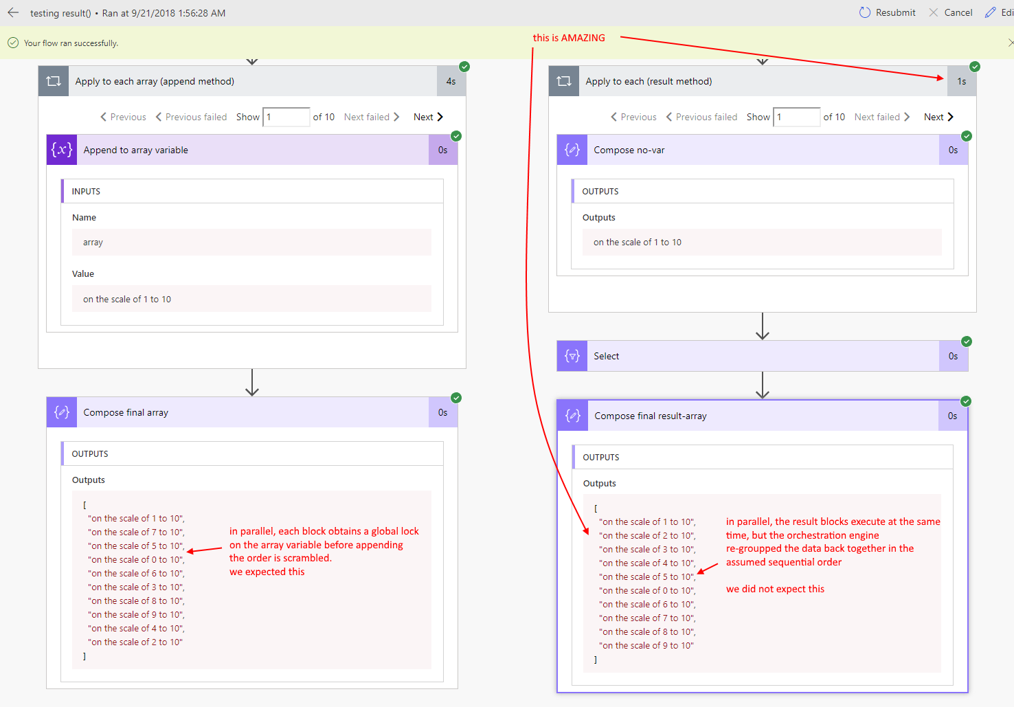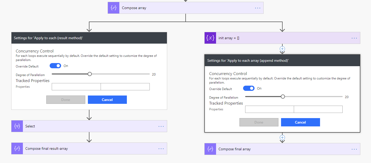 and then use result() to gather the results, all without defining an array variable. This means you can run fairly complex apply-to-each block within a scope.
