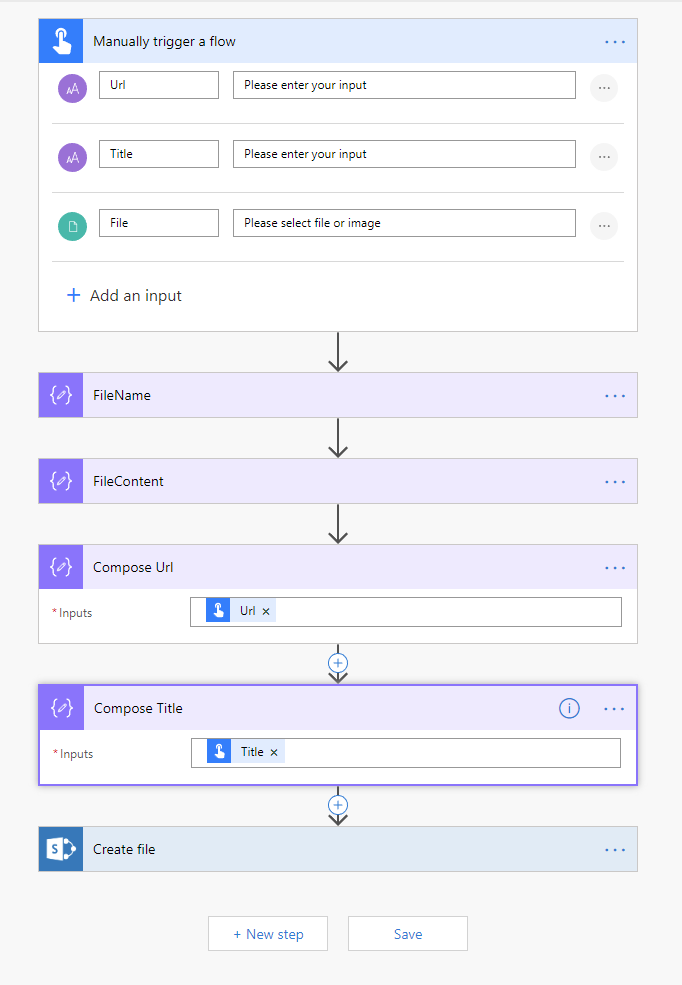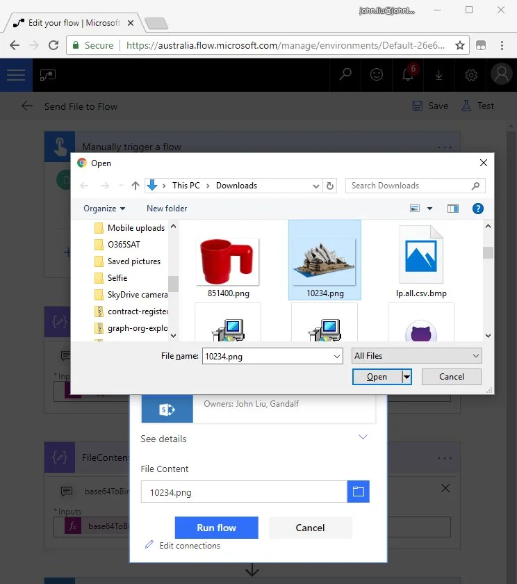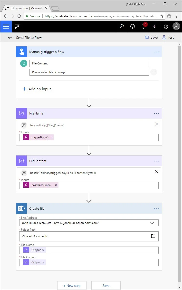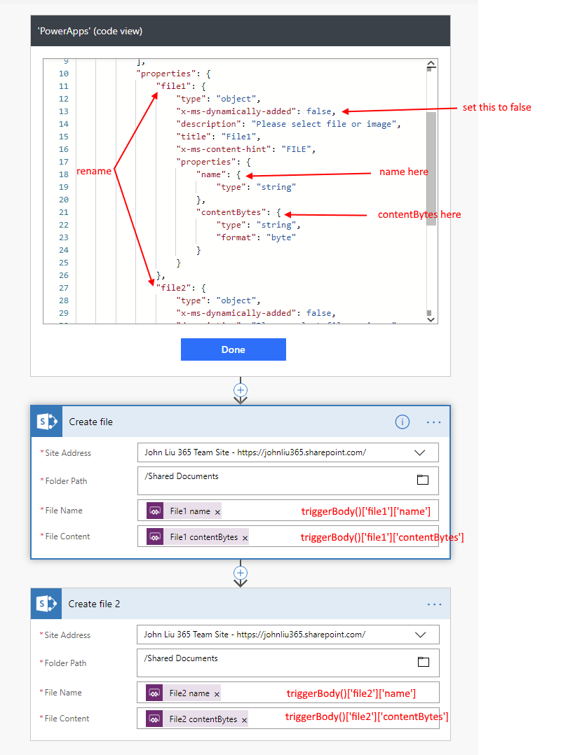 fix up references within the Flow to point to triggerBody()?[‘file1’]?[‘name’] and triggerBody()?[‘file1’]?]’contentBytes’] -