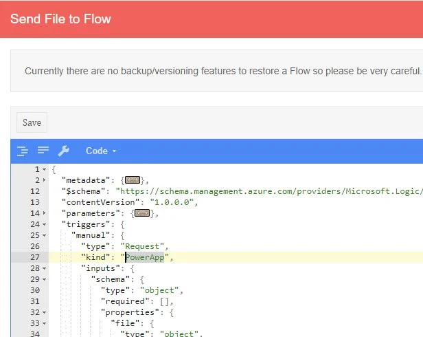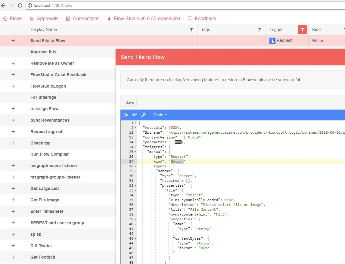 Note: Have a look at the JSON schema generated for the Flow Button’s file trigger parameter. We’ll need to know this later.