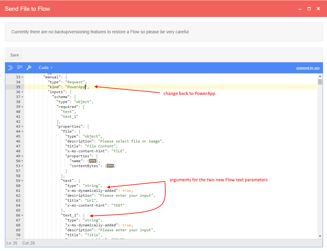 Update 2019-03 there’s some JSON definition changes to the PowerApps trigger. See note below.