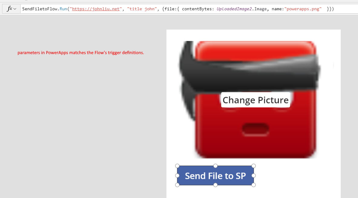 This is the first method - we can send PowerApps’ Camera to Flow via a built in dataUriToBinary() expression. But it doesn’t work for Add Picture from device gallery. We also can’t use this method for sending files - documents, zip, sound, movie clips.