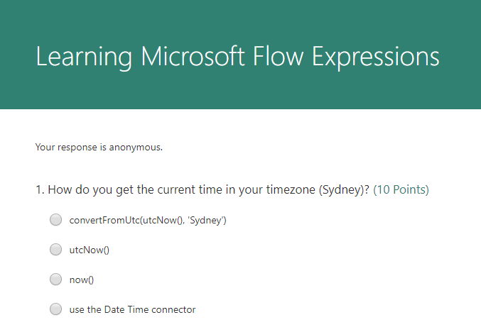 I build this Microsoft Flow “Quiz” Form for people to try test their first plateau. This is the first question.