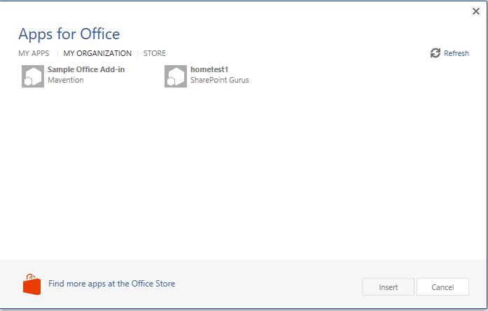 So at the end, the Office Add-In didn’t load from the App Catalog on my desktop. I went home and got it to work, here are screenshots to proof it.