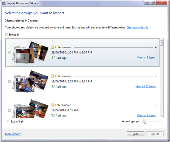 Import offers to just grab everything, or group (and mass-tag) pictures based on the time they were taken. Aka “afternoon trip”, “evening dinner @ rocks”